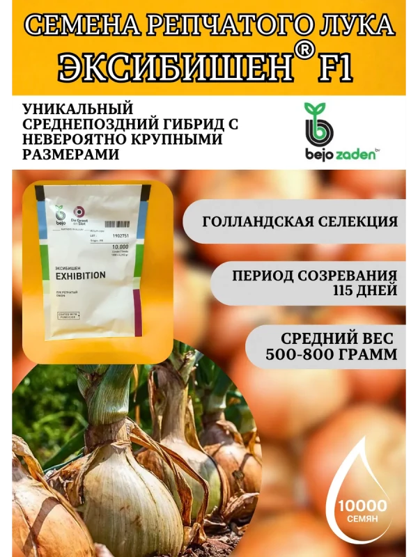 Лук «Эксибишен F1» от компании Bejo — это уникальный среднепоздний гибрид репчатого лука, прославившийся своими невероятно крупными размерами и деликатесным сладким вкусом. Период от всходов до уборки урожая составляет 115-130 дней. Гибрид предназначен для выращивания в однолетней культуре через рассаду, что позволяет получить товарную репку за один сезон.