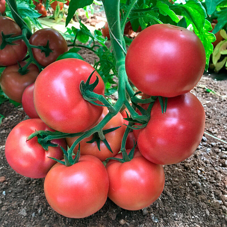 Особенности: Мощное растение с интенсивным ростом, короткими междоузлиями, сильной корневой системой и тёмно-зелёной листвой, защищающей плоды от ожогов. Сохраняет крупноплодность на всех кистях, хорошо выдерживает плодовую нагрузку.