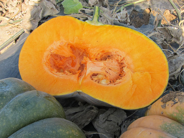 Плоды крупные, плоскоокруглой формы с характерной ребристостью, массой 5,0-8,0 кг. Они имеют привлекательную горчично-желтую окраску кожуры и насыщенно-оранжевую мякоть. Важное преимущество — маленькая семенная камера, что увеличивает выход товарной мякоти.