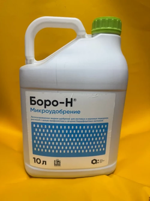 Боро-Н - бор удобрение, которое способствует синтезу и передвижению углеводов в плоды и корнеплоды, способствует прочности образующихся тканей, увеличивает производство пыльцы и образование завязей, улучшает лежкость плодов и корнеплодов, повышает сопротивляемость гнилям, оказывает бережное действие на культуры, так как не содержит натрий. Содержит бор в легкодоступной форме.